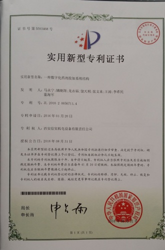 2016年8月31日,由公司申報的《一種數(shù)字化藥劑投加系統(tǒng)結(jié)構(gòu)》獲得國家實用新型專利授權(quán),取得了實用新型專利證書,專利號為:ZL 2016 2 0050711.4。證書的取得為公司技術(shù)創(chuàng)新工作再添新業(yè)績。